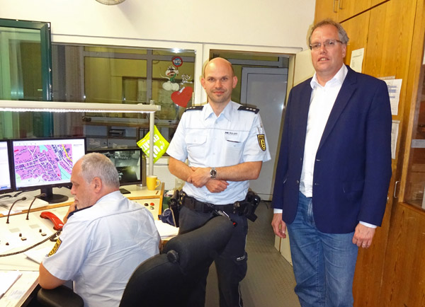 Im Nachgang zu den Einsatzfahrten machten sich die Beamten an das Verfassen der Berichte. Polizeihauptkommissar Gerhard Lauer zeigte dem Parlamentarier das Revier und erklärte die Koordination der Einsätze.