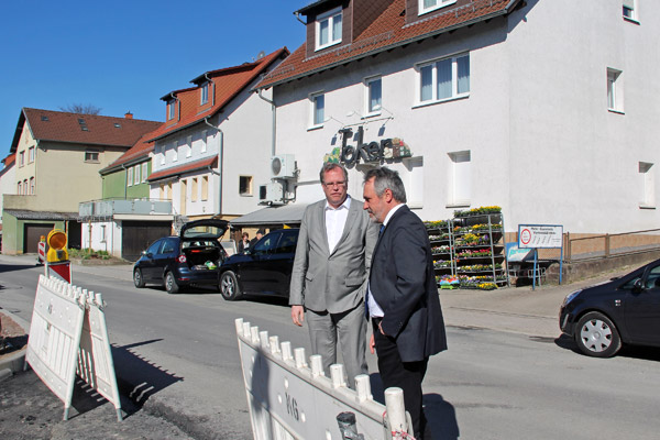 Wiesenbach. „Bis Juli dieses Jahres sollen die Sanierungsarbeiten abgeschlossen sein. Der Sommertagsumzug konnte Anfang des Monats sogar schon seinen gewohnten Weg an der Hauptstraße entlang nehmen, das freut mich persönlich sehr“, so Bürgermeister Eric Grabenbauer während einer Baustellenbegehung mit dem Landtagsabgeordneten Dr. Albrecht Schütte (CDU). Zu sehen waren dabei schon die barrierefreien Bushaltestellen, die neuen Gehwege und die zum größten Teil fertiggestellte Fahrbahn.